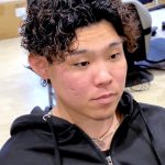 ST.GEORGE香里園店のメンズパーマ。スペインカールです。パーマのカールは強め、刈上げはスキンフェードカットになっています。バックのウェイトポイントを高くして、そこからの前下がりのシルエットがスペイン人を思わせる外国人風のシルエットです。スペインカールのセットは実は超簡単。半乾き状態からグリースを付けて形を整えるだけです。是非お試しください。